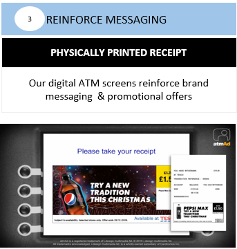 ATM screen media offers the reach and awareness benefits of DOOH, whilst also allowing brands to connect with a captive audience for up to 40 seconds whilst the transactions are being processed, and reinforce the marketing communications via printed receipt activations.