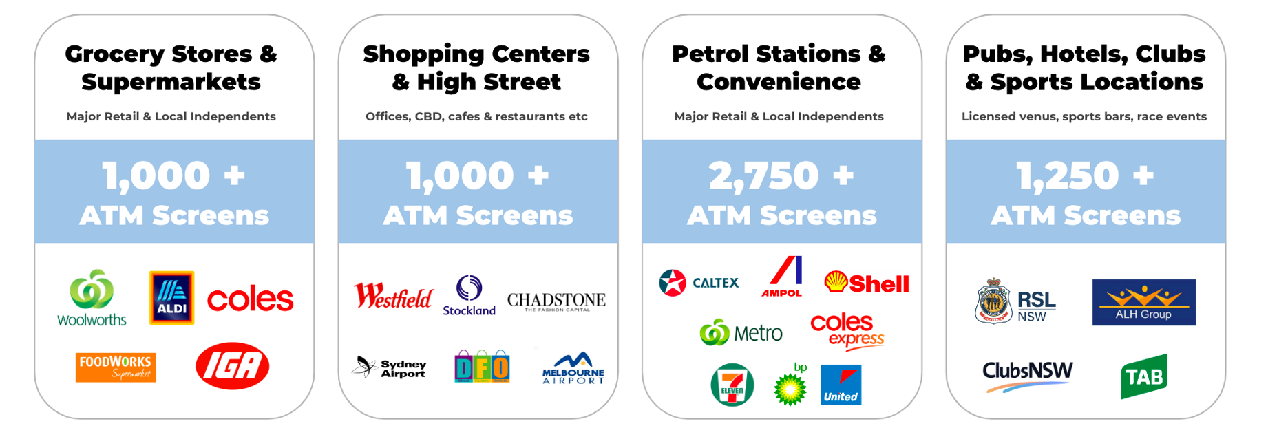 We connect retailers and brands with in-store shoppers via the ATM screen within Australia’s largest shopping centre’s, supermarkets & convenience stores, petrol stations, and licenced venues at over 6,000 locations right across Australia and New Zealand.